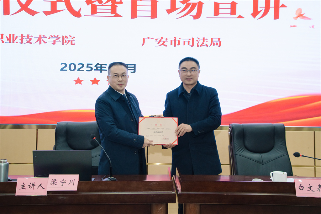 为进一步弘扬宪法精神,深植法治信仰,引领广大青年学生学思践悟习近平法治思想,12月3日,广安职业技术学院、广安市司法局联合开展“宪法法律进高校”活动。广安市司法局党组成员、副局长梁宁川为200余名师生带来了一场以“循法而行,让青春在法治的天空激情飞扬”为主题的学习贯彻习近平法治思想专题讲座。学校党委委员、组织部部长白文春致辞,并为梁宁川同志颁发了法治副校长荣誉证书。