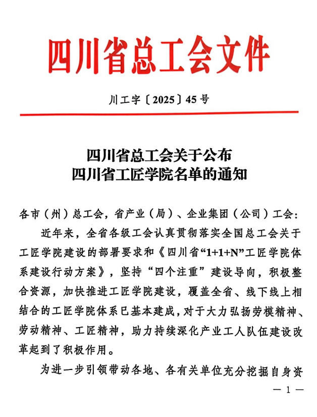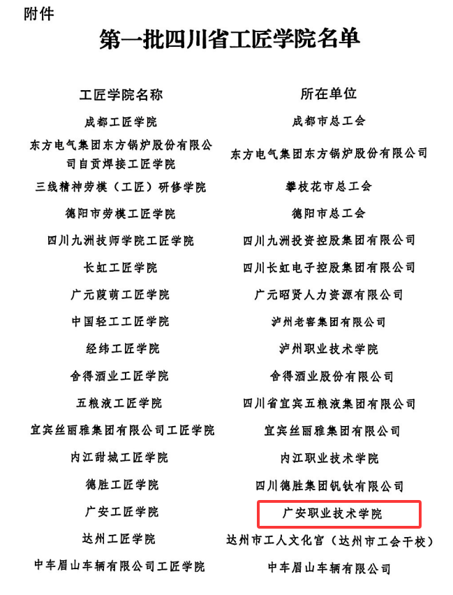 日前,四川省总工会发布了《四川省总工会关于公布四川省工匠学院名单的通知》,全省批复首批29家工匠学院,广安市总工会与我校共建的“广安工匠学院”成功入选。